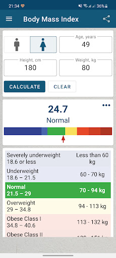 The BMI Calculator app for Android helps you calculate your body mass index (BMI) using your height and weight information. There are two versions of the calculator: the classic version only considers height and weight, while the extended version also takes age and gender into account. The calculator uses sliders for input and displays the result as a color bar, where each color represents a different BMI status. Moving the result slider shows you the corresponding weight for each BMI indicator. The BMI is a measure of how your weight relates to your height and helps determine if your body weight is within the normal range. It is calculated by dividing your weight in kilograms by the square of your height in meters. The app follows the World Health Organization's recommendations for interpreting BMI results, with a normal range between 18.5 and 25.