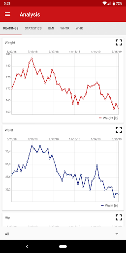 | Weight Companion | Yes | In App: | • Enter body weight (kg/lb), waist, and hip (cm/in) measurements quickly • Evaluate your measurements graphically, incl. BMI, WHtR, and WHR • See analysis graphs in fullscreen • Share measurements with family, friends or the world |