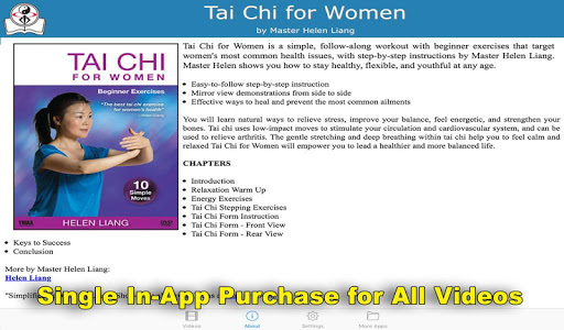 | Tai Chi for Women (YMAA) | Yes | In App: $9.99 per item | • Easy-to-follow step-by-step instruction, streaming or download • Mirror view demonstrations from side to side, front and rear view • Effective ways to heal and prevent the most common ailments • Introduction |
